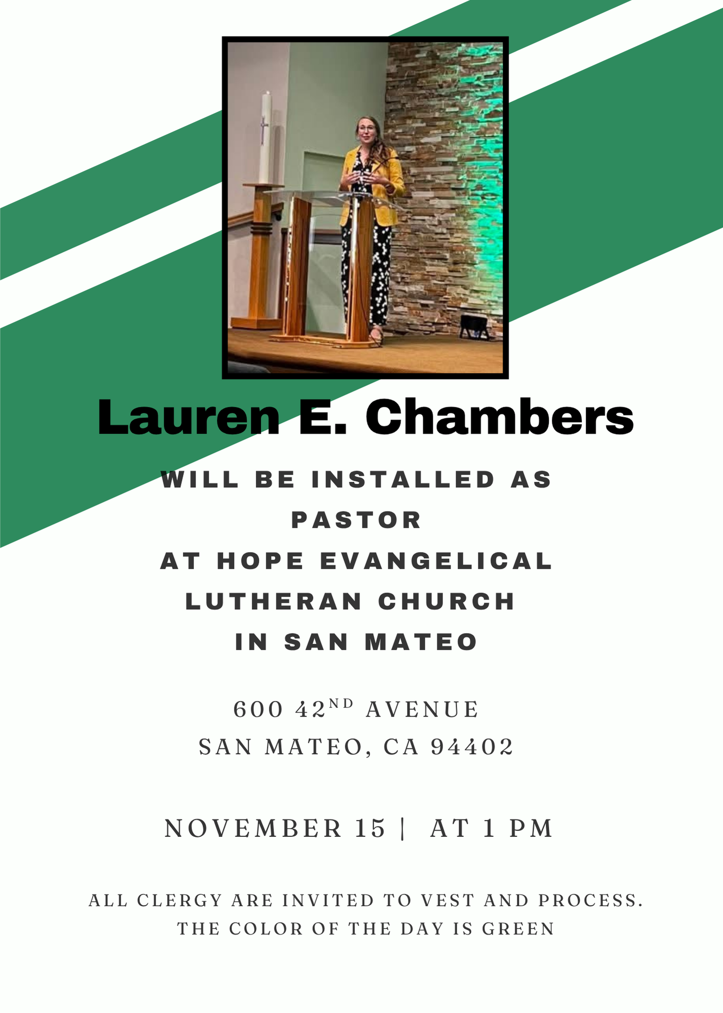 All are warmly invited to celebrate the installation of The Rev. Lauren E. Chambers as Pastor of Hope Evangelical Lutheran Church in San Mateo. Clergy are invited to vest and process; the color of the day is green.