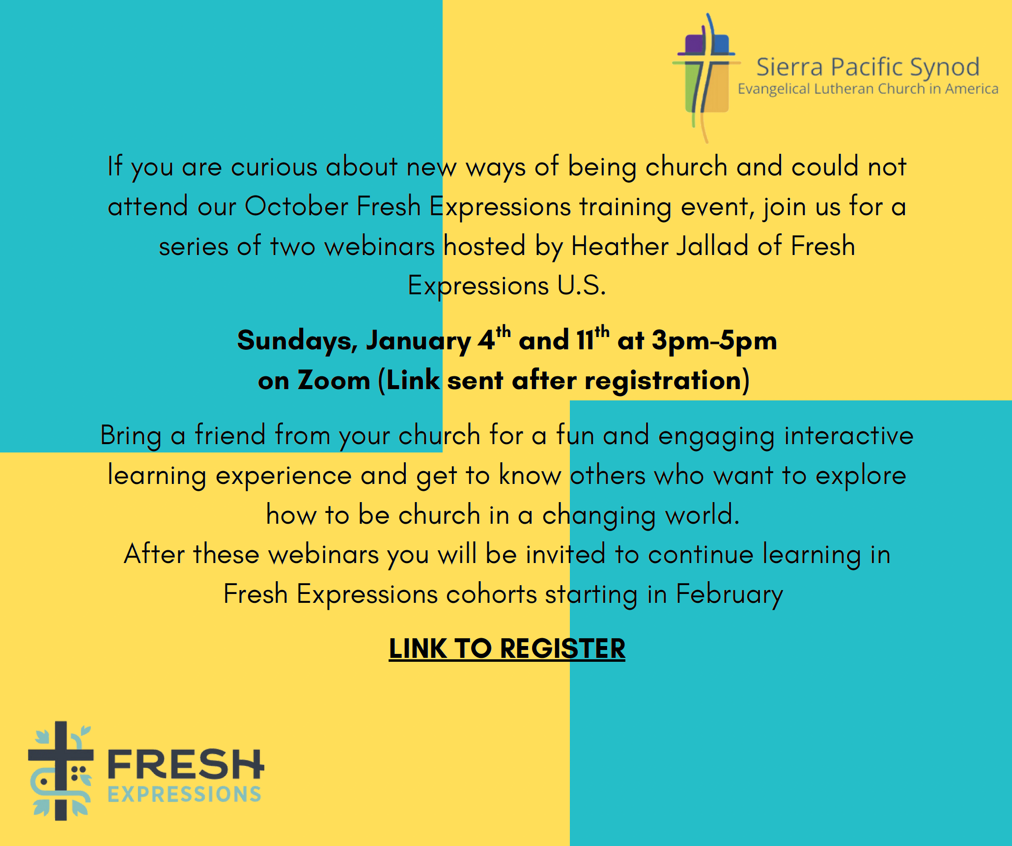 If you missed our October Fresh Expressions training—or want to keep exploring—join us for a two-part webinar serieshosted by Heather Jallad of Fresh Expressions U.S. on Sundays, January 4 and 11, from 3:00–5:00 pm on Zoom. Please bring a friend and enjoy an engaging, interactive learning experience as we explore how to share the good news in a changing world. Participants will also be invited to continue learning in Fresh Expressions cohorts beginning in February.
