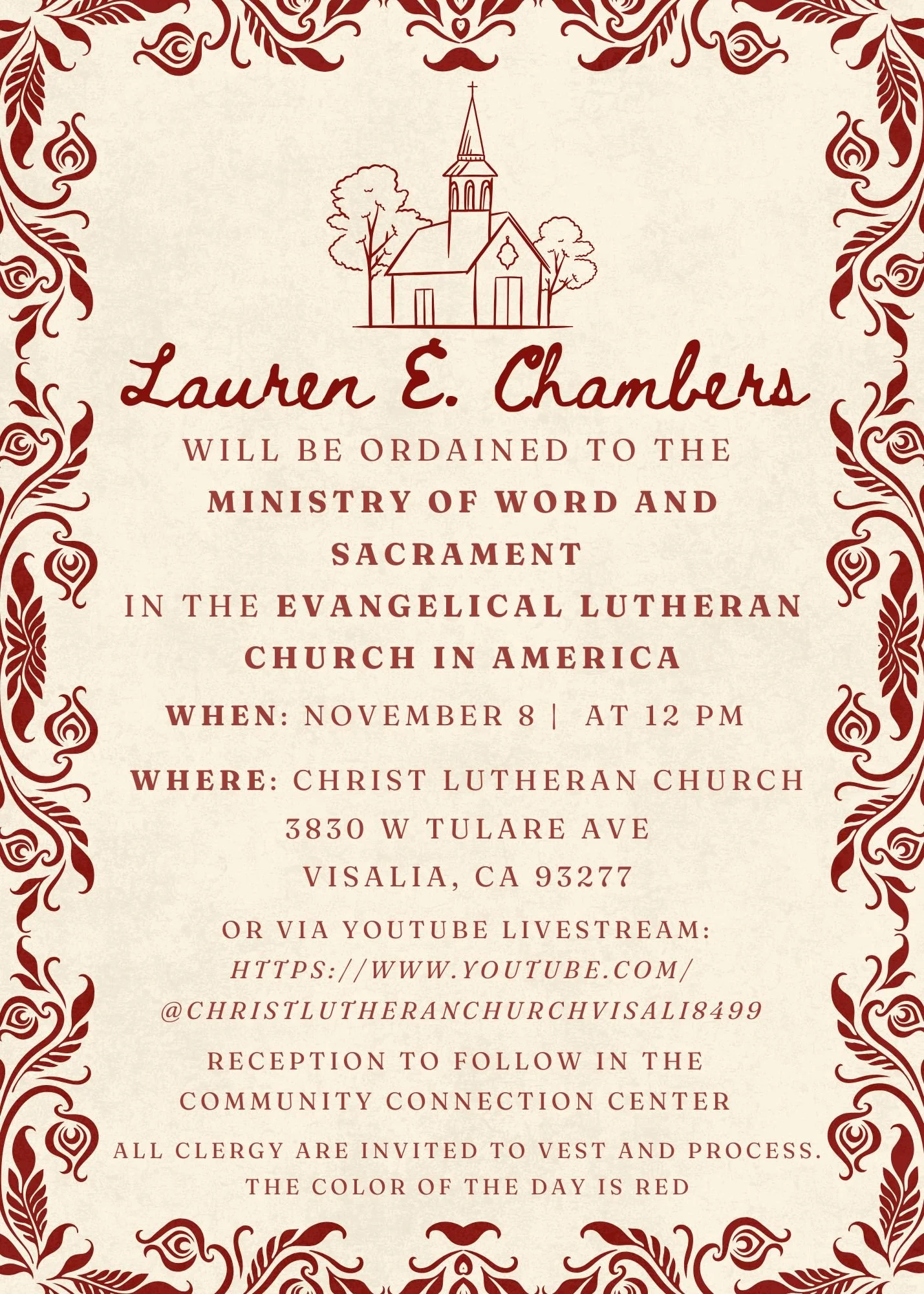 Join us in celebrating the Ordination of Lauren E. Chambers into the Ministry of Word and Sacrament! She has been called to Hope Lutheran San Mateo!